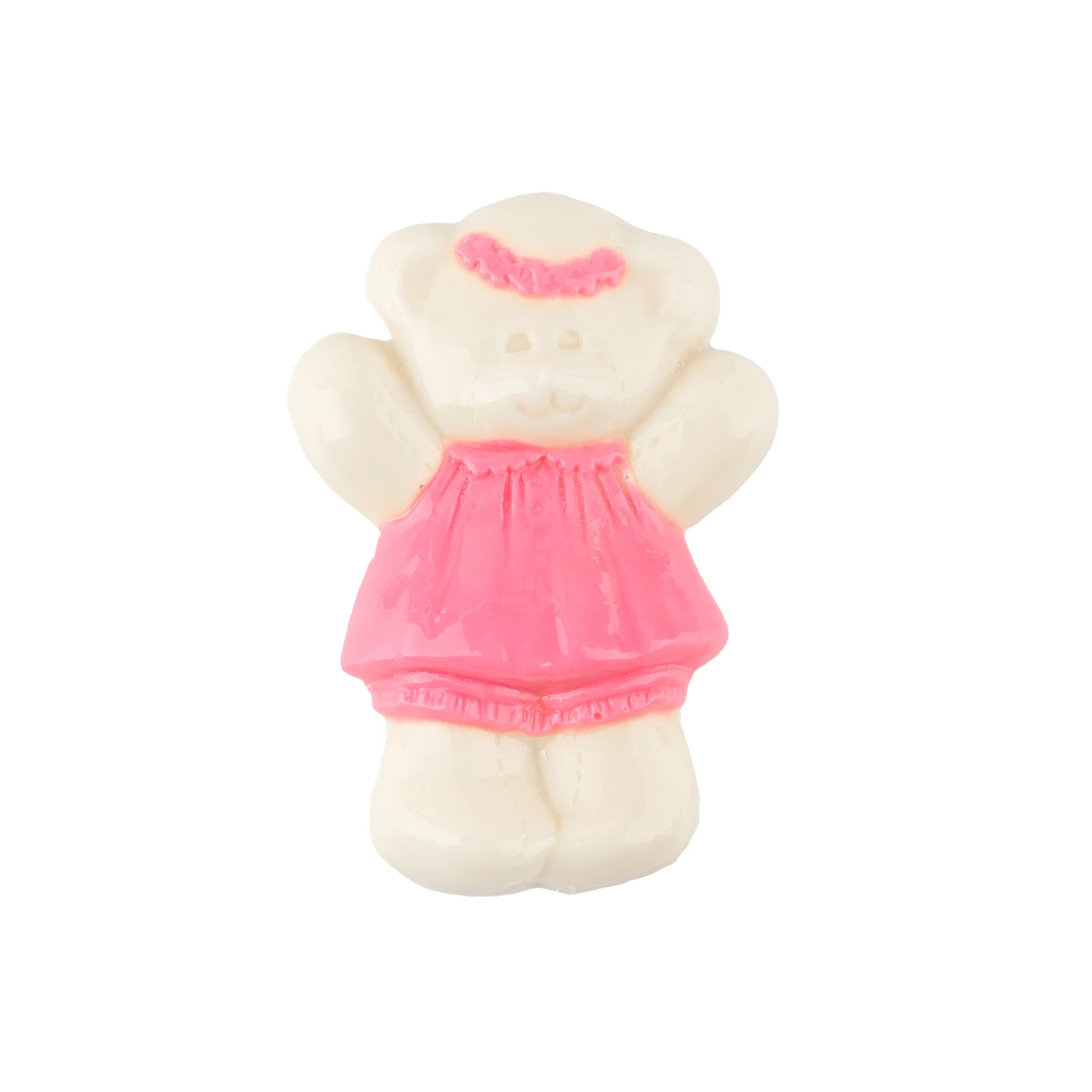 Our Baby Bear Girl is made of solid milk or white with pink accents.