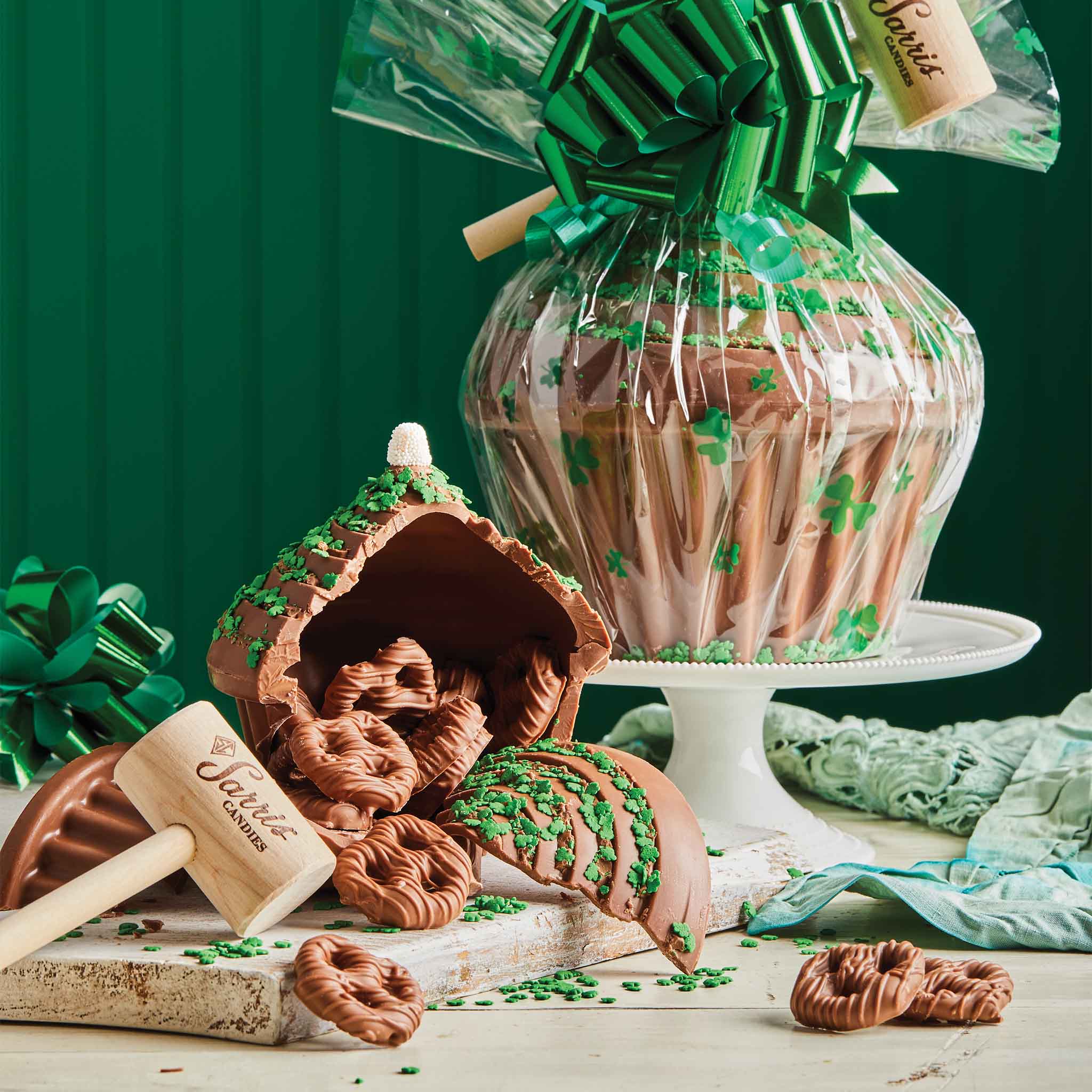 St. Patrick's Day just got a whole lot luckier. Our BashCake® is a table top chocolate pinata filled with Milk Chocolate Covered Mini Pretzels and decorated for St. Patty's Day celebrations. Use the wooden mallet to break the shell for an explosion of taste to make your day a "hit." Each BashCake® is handmade and hand decorated. Individual weights may vary slightly.